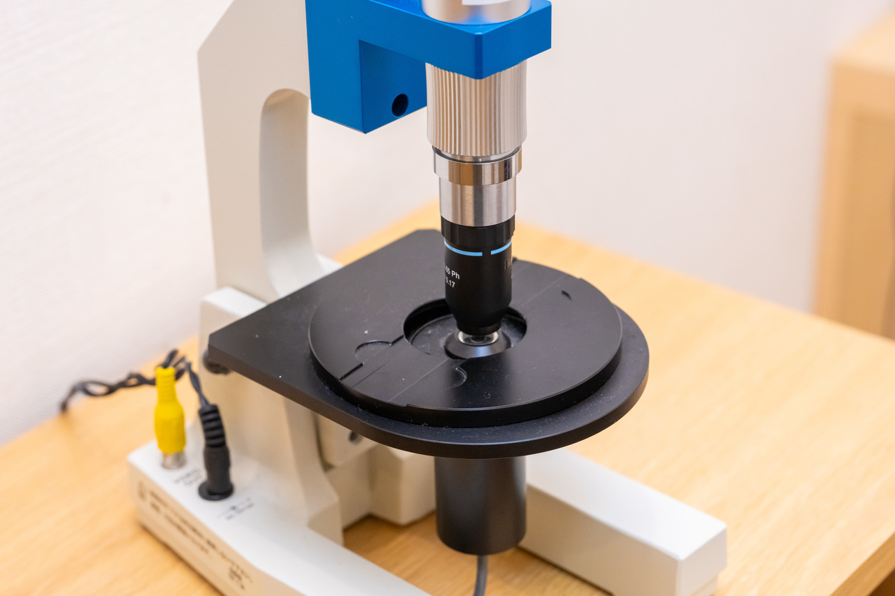 お口の中のプラーク(歯垢)を少しだけ採取し、位相差顕微鏡(いそうさけんびきょう)で拡大して確認します。